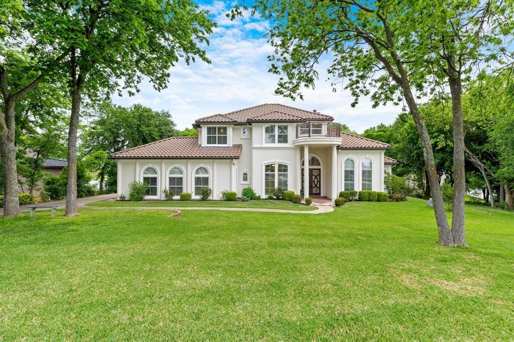 Stunning Mediterranean estate set on a private one-acre cul-de-sac lot with direct frontage and water access on Lake Lewisville. Low traffic location, sweeping lake views, and a functional floor plan make this a rare find in the Dallas-Fort Worth market. Inside, the home offers 5 bedrooms, 5.5 baths, two distinct living areas, a loft, and two fireplaces, providing flexibility for both everyday living and entertaining. The open layout draws in natural light and frames lake views from the main living. The loft is well-suited for a game room, or play space and a balcony with lakefront views. Each bedroom features its own en-suite bath, and the primary suite is a true retreat with generous square footage and water views. The kitchen is designed for the serious home cook with ample counter space, quality appliances, and easy flow to the main living area. Both fireplaces, one in the main living room and one in the secondary living space, add warmth and character throughout the cooler months. Step outside to a covered outdoor area overlooking the water, ideal for entertaining or unwinding at the end of the day. Direct lake access puts boating, fishing, and watersports right at your doorstep on one of North Texas's most popular lakes. The oversized 3-car garage offers space for vehicles, watercraft gear, and additional storage. One-acre cul-de-sac lots with this combination of privacy, views, and direct lake access are exceptionally rare. Call today to schedule your private showing.