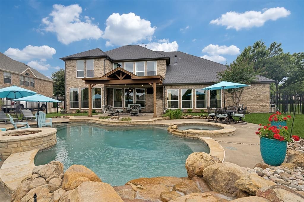 Beautifully upgraded 5-bedroom, 4-bath home on the golf green in the gated Broadmoor Estates section of Waterview, offering stunning views and a 3rd of acre lot with a lagoon-style pool, waterfall, fire pit & covered patio. Enjoy resort-style living with access to an 18-hole golf course, clubhouse, parks, trails, tennis courts, and a separate full size community water park—perfect for additional recreation and entertaining.This home offers one of the most enhanced interiors in the neighborhood with hardwood floors downstairs, all new carpet, and new windows (2021). The expansive designer kitchen is a true centerpiece featuring custom cabinetry, two oversized islands, quartzite countertops, a professional-grade 36” range with second oven, built in beverage fridge, custom hood, and designer tile. A functional layout includes a large downstairs guest room next to a full bath, front study, formal dining, and open living area, plus a large game room and dedicated media room upstairs. The primary suite showcases a luxurious spa-inspired bath with an oversized wet room shower with multiple shower heads and a freestanding tub. Abundant storage throughout, oversized laundry room, and a 2-car garage plus separate 1-car garage. A rare opportunity offering extensive upgrades in all the right places with premium golf course frontage and views.